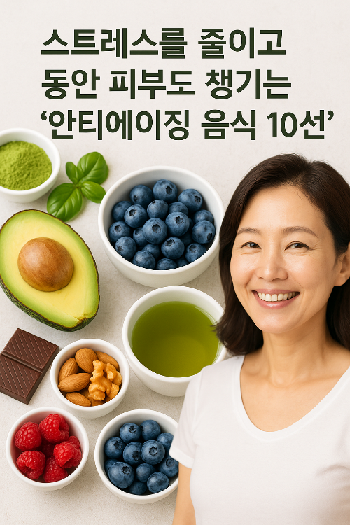 1. 스트레스와 노화, 밀접한 관계스트레스는 단순히 기분만 나쁘게 하는 것이 아닙니다. 지속적인 스트레스는 체내 활성산소를 증가시켜 세포 노화를 촉진하고 피부 탄력을 저하시킵니다. 특히 코르티솔 호르몬이 과도하게 분비되면 피부 재생이 느려지고 주름이 쉽게 생기게 됩니다. 따라서 스트레스를 줄이는 식단은 곧 안티에이징 식단이라고 볼 수 있습니다. 2. 안티에이징과 스트레스 해소에 효과적인 음식 10선블루베리 – 강력한 항산화제인 안토시아닌이 풍부해 세포 노화를 늦추고 뇌 건강에도 좋습니다.아보카도 – 비타민 E와 건강한 지방이 피부 보습과 염증 완화에 탁월합니다.녹차 – 카테킨 성분이 스트레스 호르몬 분비를 억제하고 피부 탄력을 개선합니다.다크 초콜릿 – 플라보노이드가 혈액순환을 도와 피부에 활력을 줍니다..